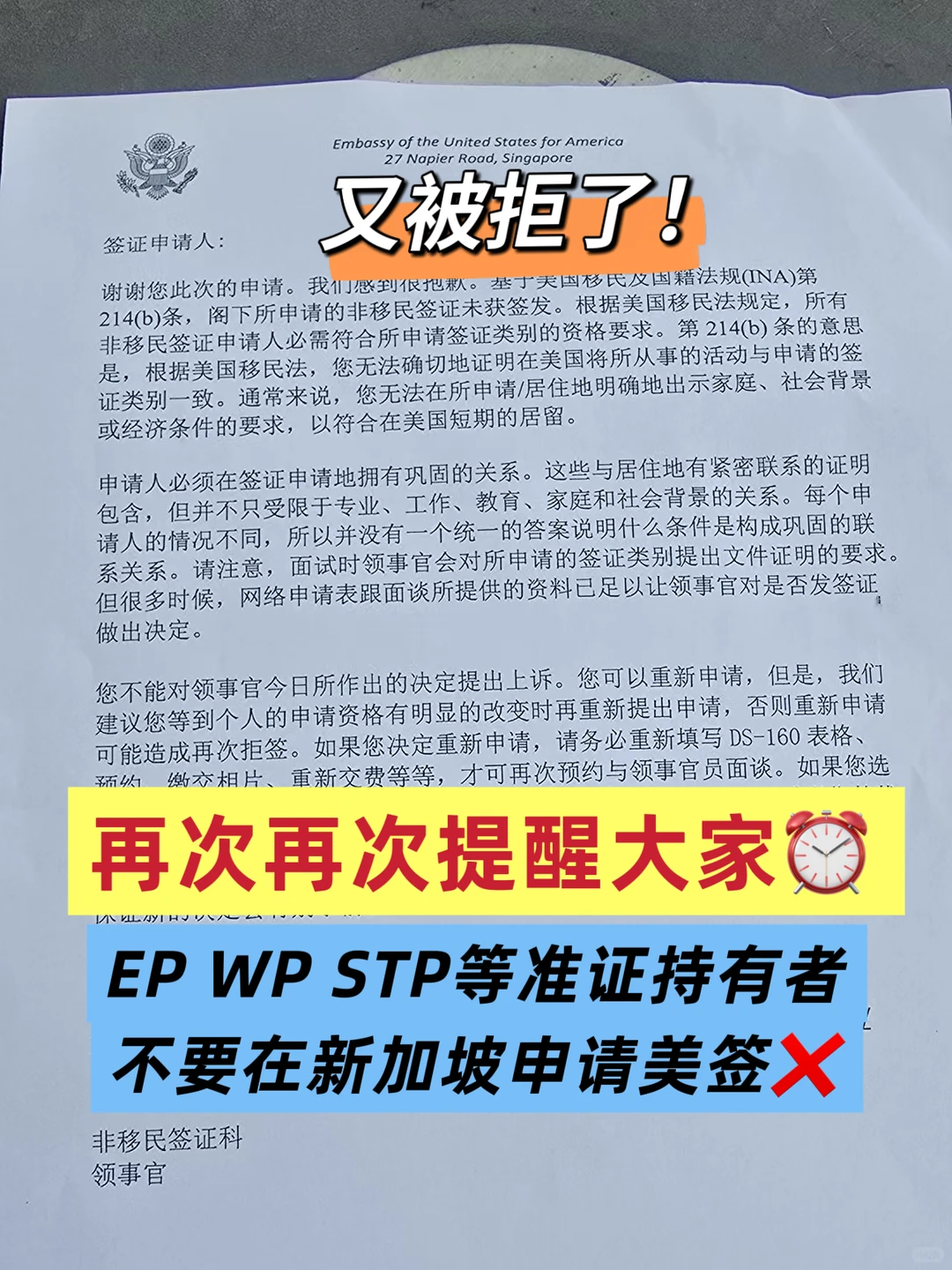 这不是空穴来风。我们已接连收到多位同学和申请者的反馈:即使拥有新加坡EP这样含金量较高的准证,在美国驻新加坡使馆面前,也依然惨遭拒签!