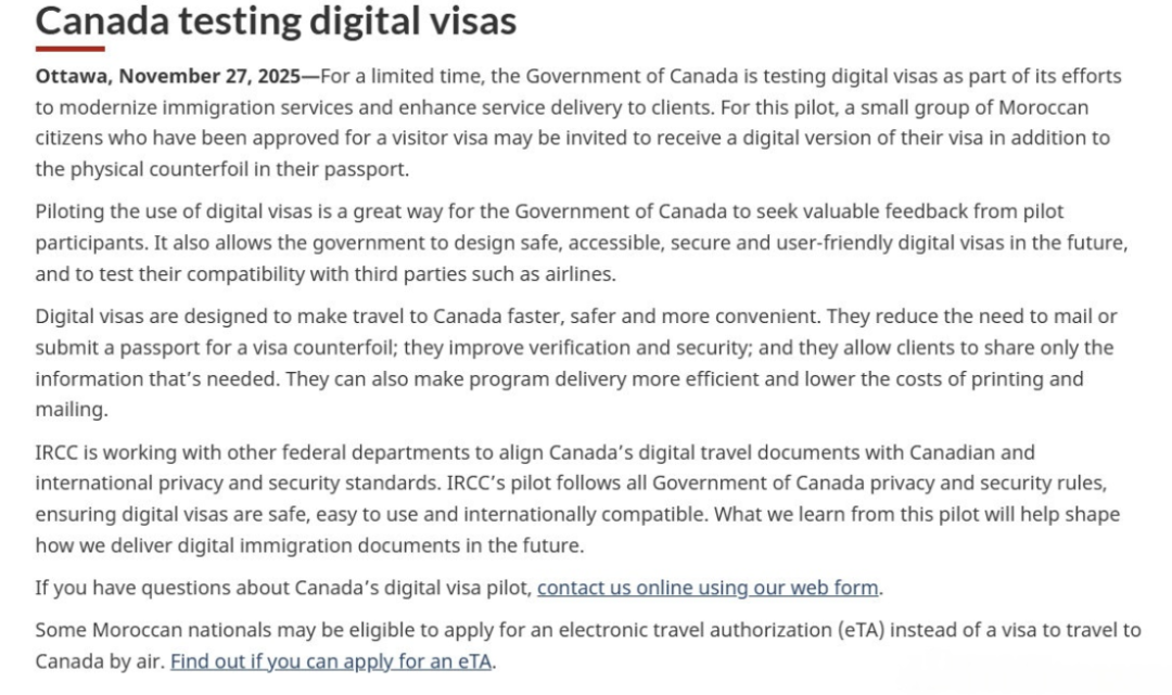 根据加拿大移民、难民和公民部(IRCC)在2025年11月27日的官方宣布,加拿大已正式启动电子签“数字签证(DigitalVisa)”全球试点项目。