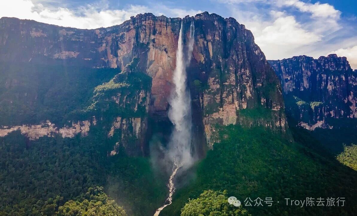 其实全世界最高的瀑布-安赫尔瀑布(Angel Falls),是委内瑞拉最有名的景点。该瀑布位于委内瑞拉玻利瓦尔州圭亚那高原、卡罗尼河流域的瀑布。安赫尔瀑布普遍被视为按高度排列的瀑布列表中“世界最高的无中断瀑布”,总高度达979米,其中主要的直落段高度为807米。因落差极大,水流在空中常被风吹散,未落地已成水雾。瀑布位于加奈马国家公园内。该国家公园同时被联合国教科文组织列为世界遗产。被很多旅行者评价为“南美最原始、最壮观的自然景观之一”