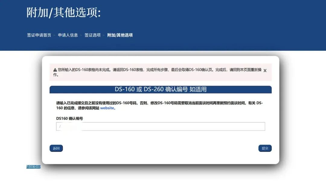 1、请勿使用未完成的DS-160表格编号进行预约。系统会提示:您所输入的DS-160表格尚未完成,并会要求您返回表格完成所有步骤。