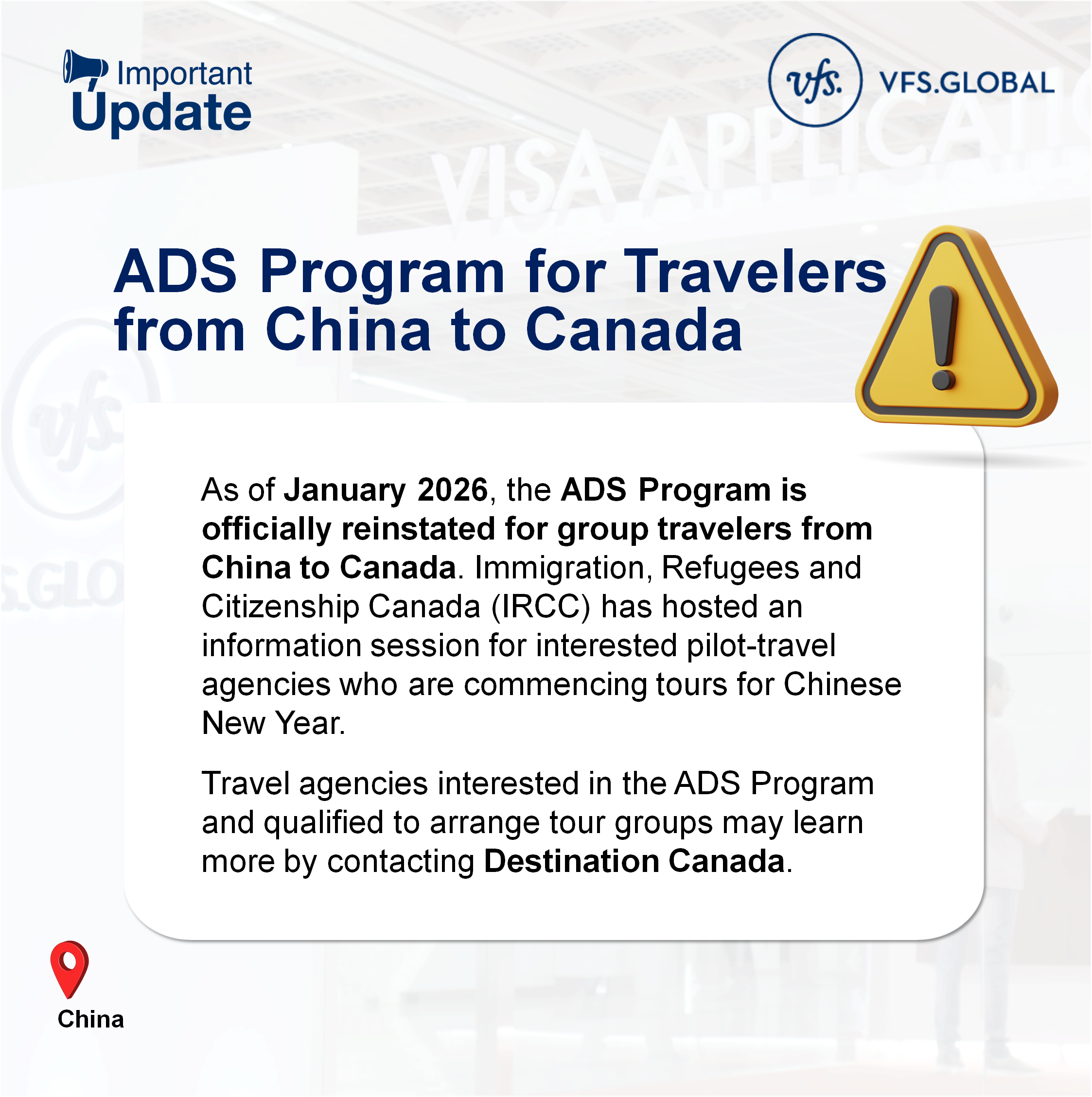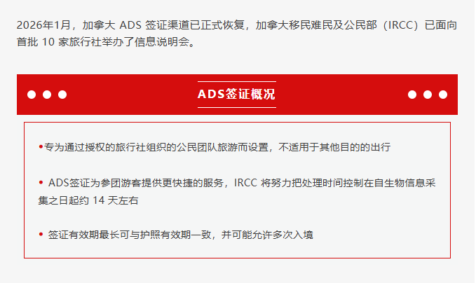 2026年1月起,加拿大ADS签证项目正式恢复对中国赴加团体游客的接待!